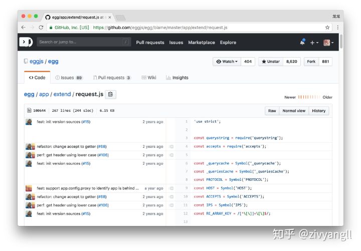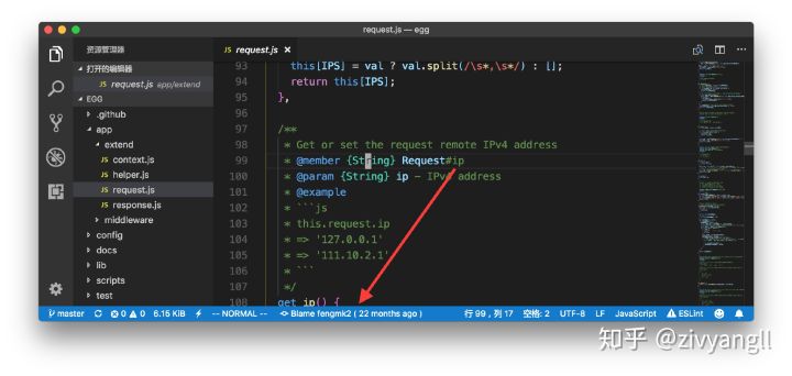 例如,查询 request.js 第 99 行代码是谁提交的,命令为: