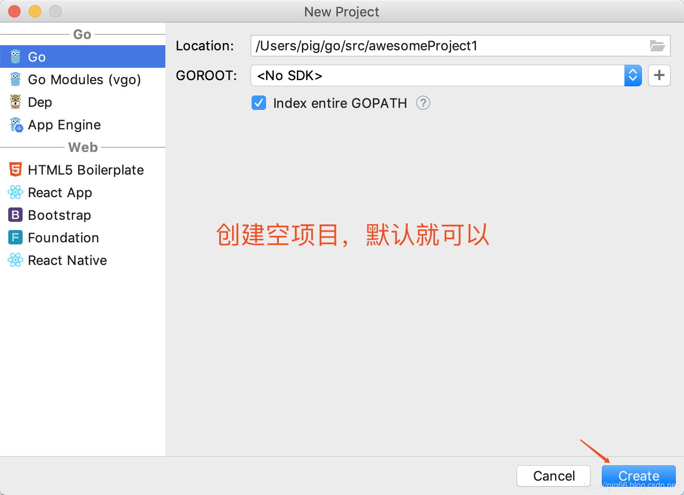 如果你之前已经使用有效期激活过可跳过此步骤,如果你是刚下载的GoLand,则需要点击激活窗口的“Evaluate for free”免费试用,然后再创建一个空项目,这样就可以进入到GoLand的工作页面3.修改配置文件