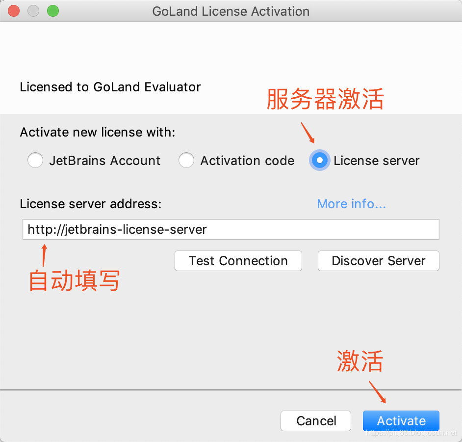 一、选择最后一种License server激活方式,地址填入:http://jetbrains-license-server(应该会自动填上),或者点击按钮:”Discover Server”来自动填充地址,完成激活