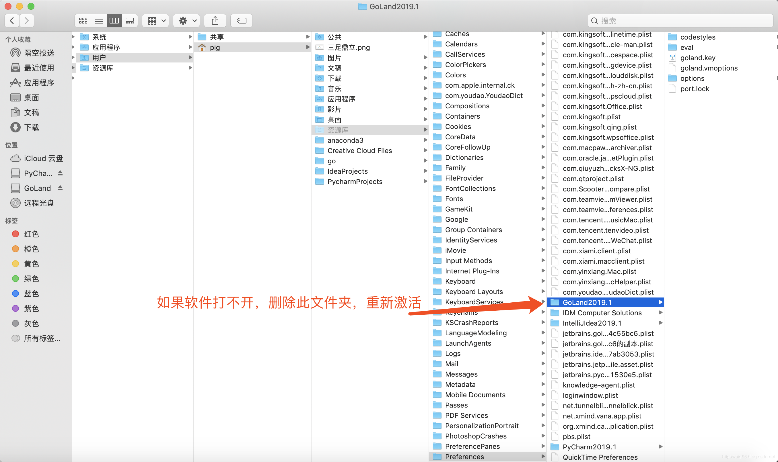 请仔细检查补丁路径是否正确,如果错误则会出现GoLand打不开的情况,这时候可以删除用户配置目录下的goland文件夹: