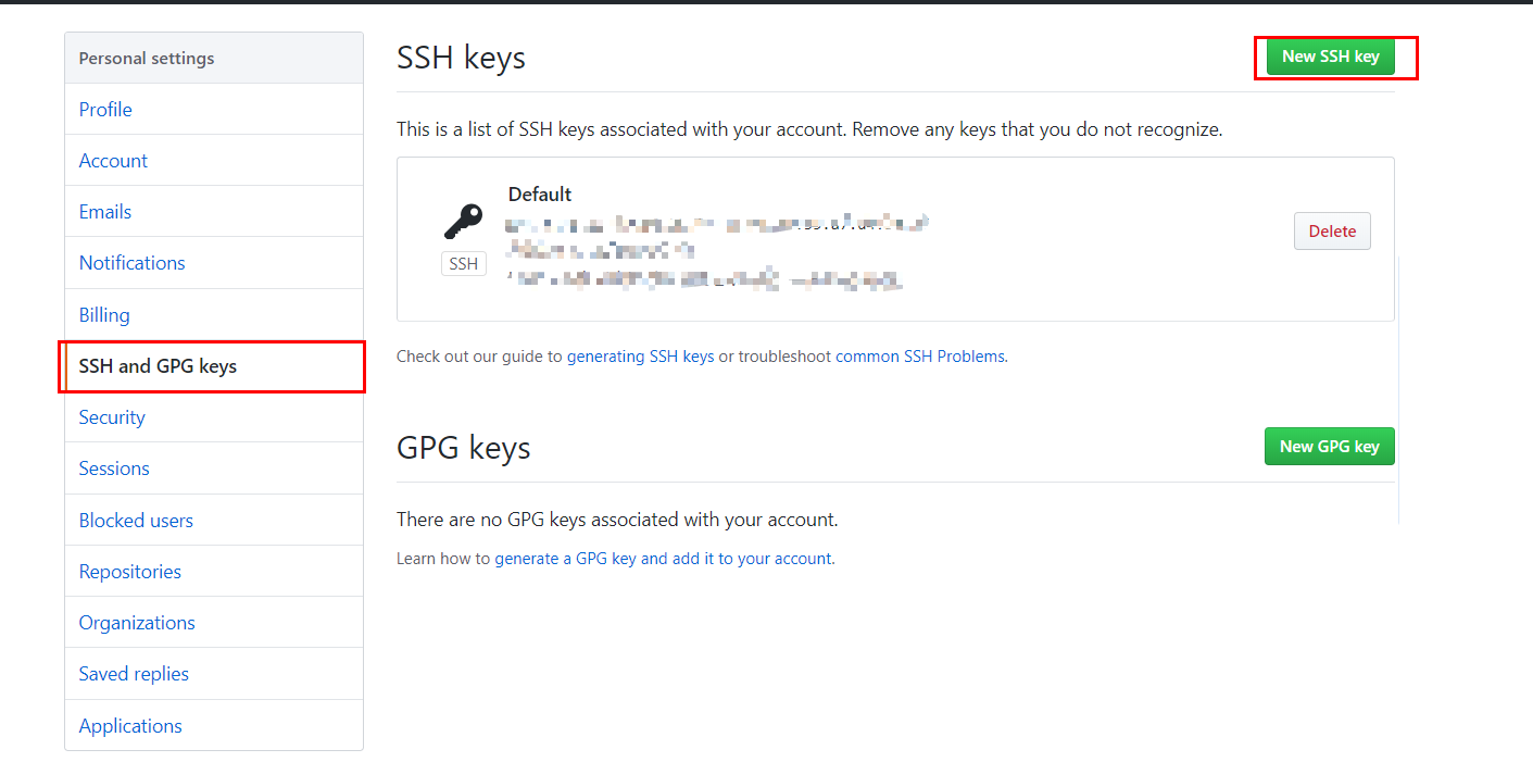 这里提一下,有的时候你的本地向GitHub提交提交不上去,但之前还是可以的,这时候可以检查GitHub的SSH密钥这里,可能是因为安全问题,官方给你暂时冻结了这个密钥,冻结的情况下这里的Delete旁边就会多一个激活按钮,点一下就好了。