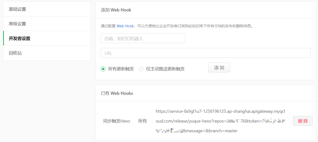 可以选择所有更新触发或者主动触发,主动触发的意思即发布需要勾选一个选项才会触发webhook。具体可参见语雀文档;