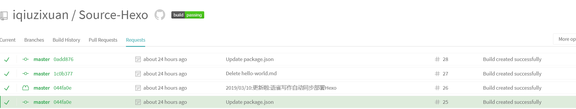 发布或者更新一篇文章后,我们前往travis-ci,可以看到已经触发了一次构建请求: