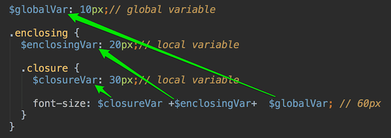 一个全局变量能被申明在选择器和构造器(比如mixin)外,其他的变量就是当前作用域变量。
