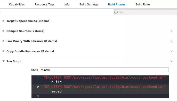 3.在Xcode的build phases添加"$FLUTTER_ROOT/packages/flutter_tools/bin/xcode_backend.sh"