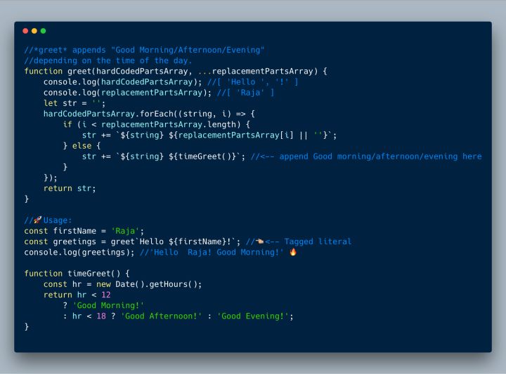 ; //����<– Tagged literalconsole.log(greetings); //‘Hello Raja! Good Morning!’ ��