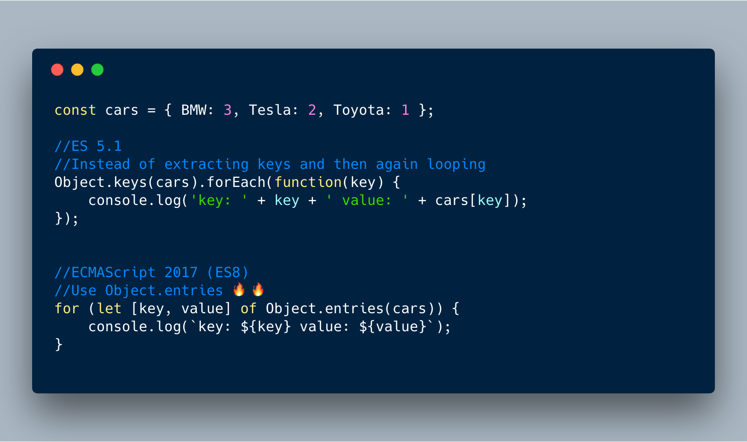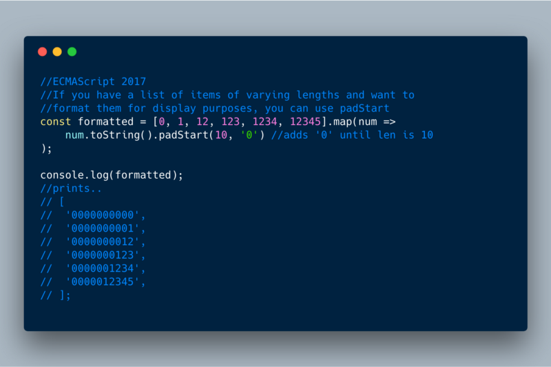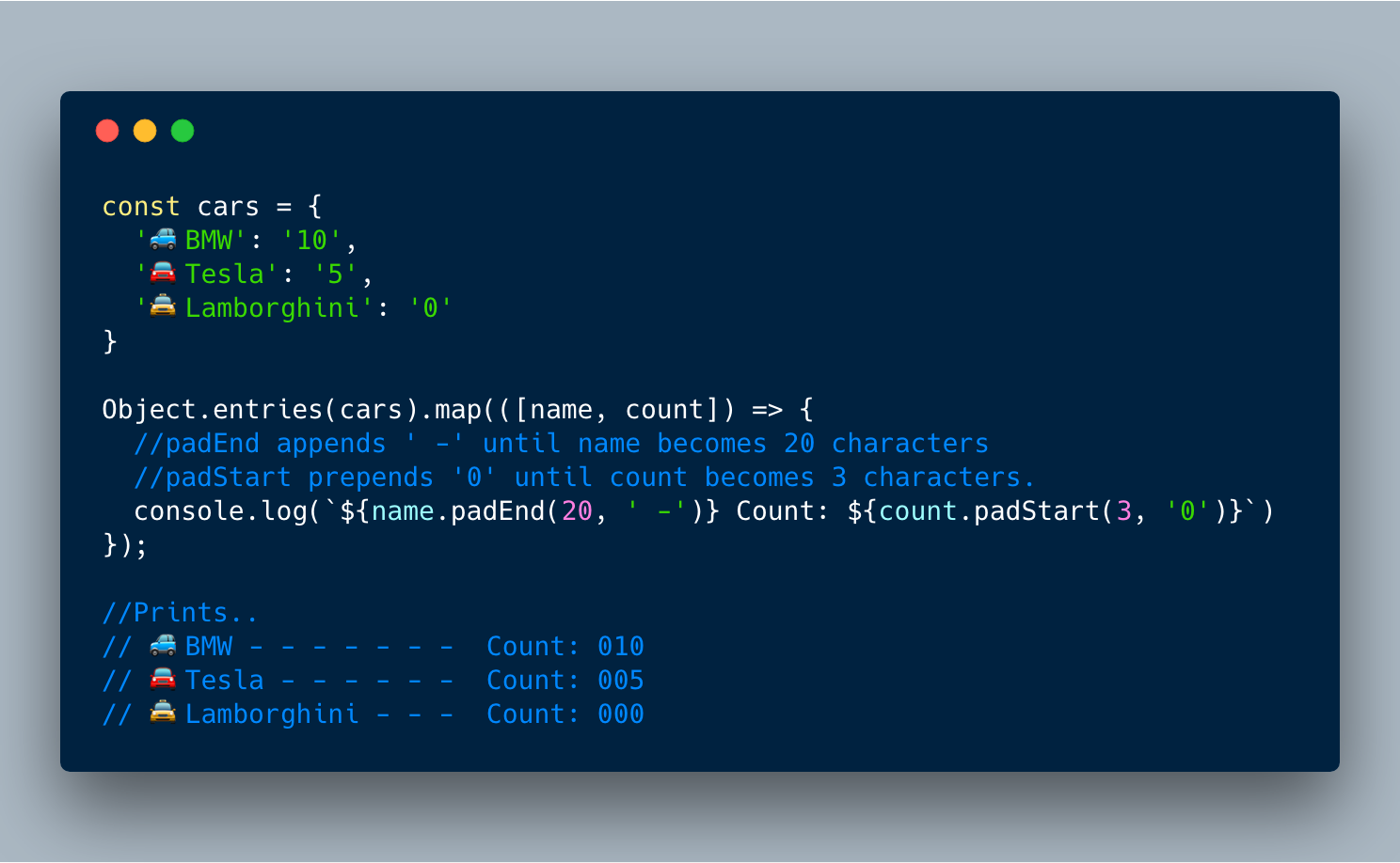 下面的示例是 padEnd,padStart 和 Object.entries 组合在一起以产生漂亮输出的一个很好的现实示例。