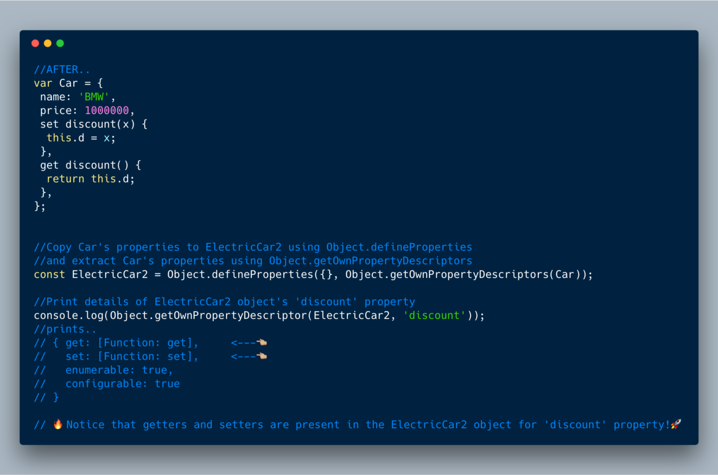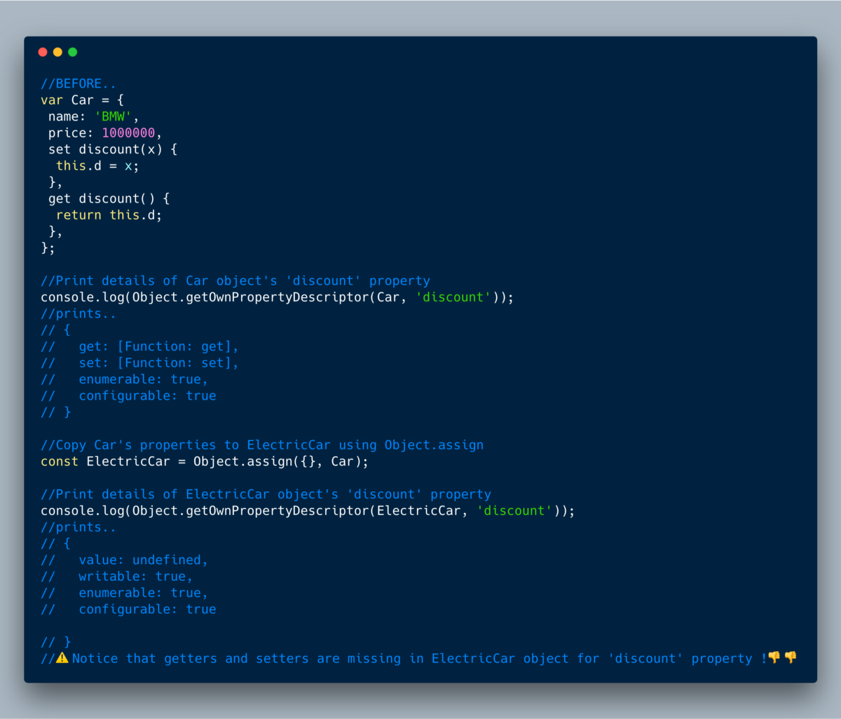 下面的示例显示了 Object.assign 和 Object.getOwnPropertyDescriptors 以及 Object.defineProperties 之间的区别,以将原始对象 Car 复制到新对象 ElectricCar 中。 你将看到,通过使用 Object.getOwnPropertyDescriptors,discount getter 和 setter 函数也会复制到目标对象中。