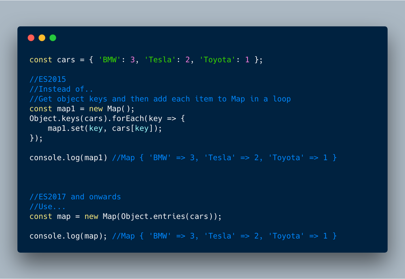 Object.entries() 与 Object.keys 相关,但它不仅仅返回 keys ,而是以数组方式返回 keys 和 values 。这使得在循环中使用对象或将对象转换为 Maps 等操作变得非常简单。