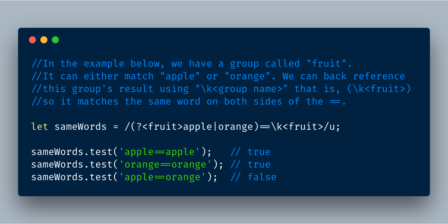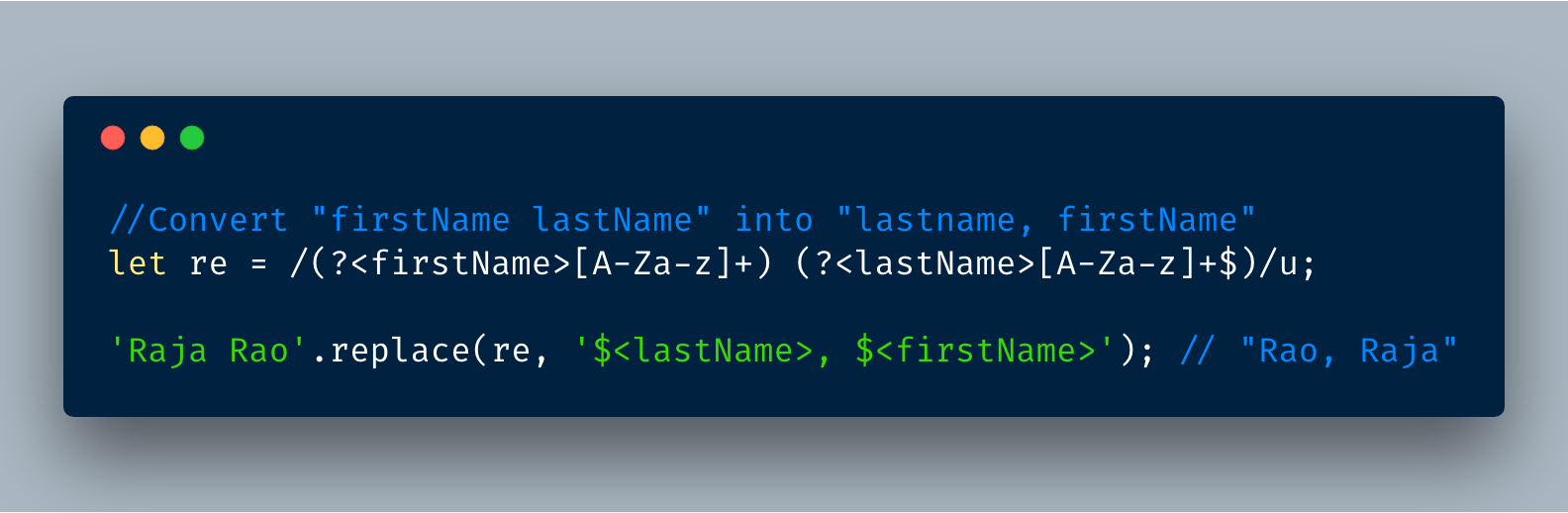 这个增强功能带来了其他语言(如Python,Java等)的有用 RegExp 功能,称为“命名组”。这个功能允许允许正则表达式给每一个捕获组起一个名字 (?