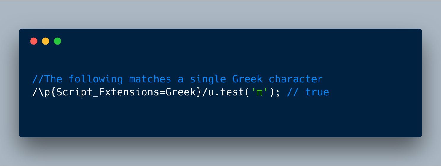 - /\p{Script_Extensions=Greek}/u.test(‘π’); // true