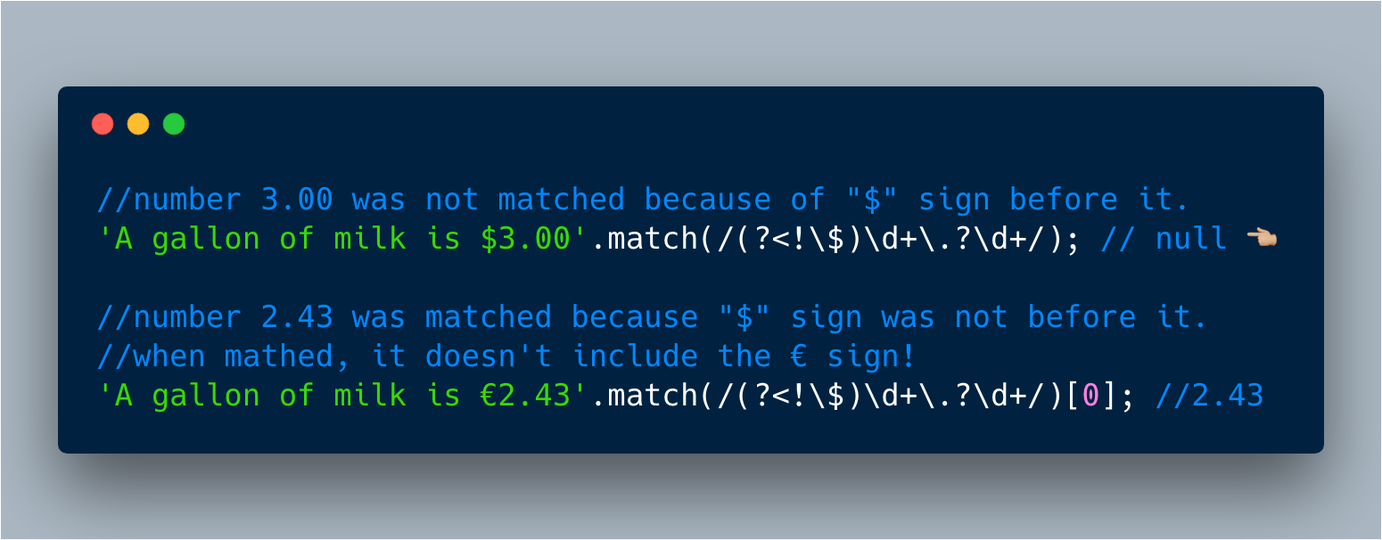 此外,你可以使用 (?<!…)(问号,小于,感叹号)来查看后行断言。基本上,只要-ve断言通过,这将匹配。