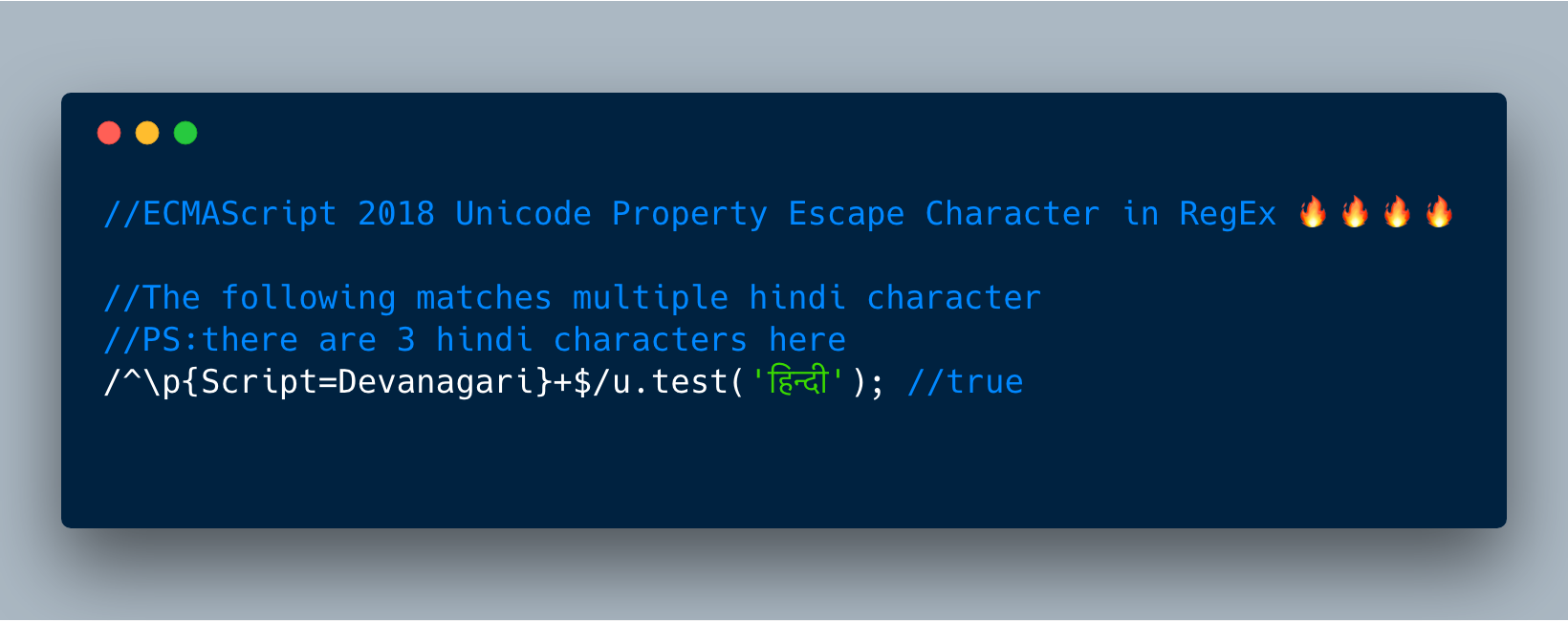从 ECMAScript 2018 开始,我们可以使用 \p 来转义字符以及 {Script = Devanagari} 以匹配所有这些印度字符。也就是说,我们可以在 RegEx 中使用:\p{Script=Devanagari} 来匹配所有梵文字符。