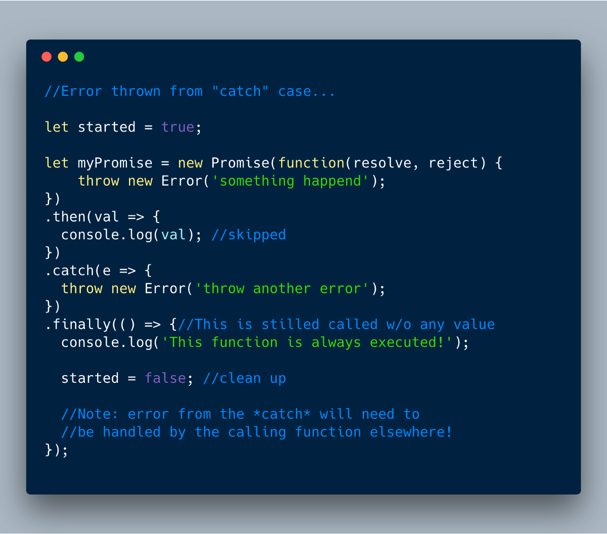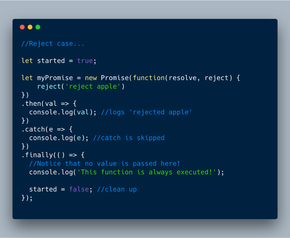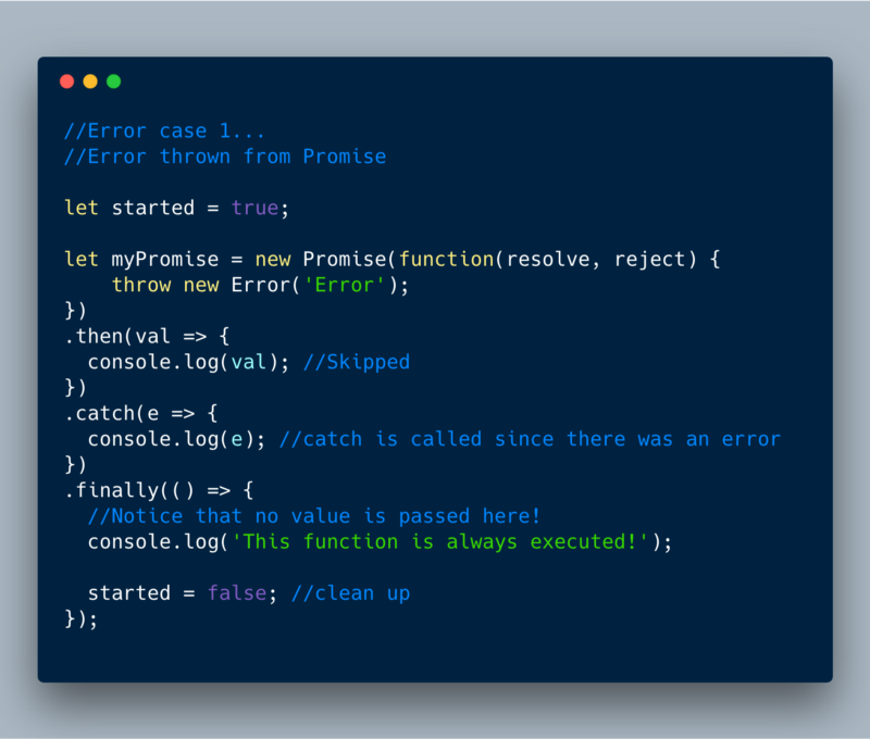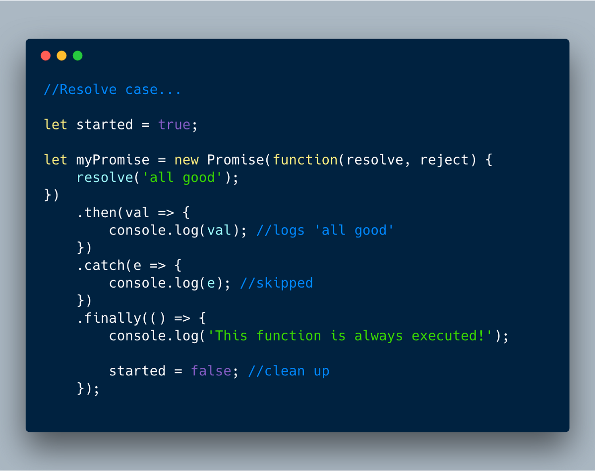 finally() 是一个添加到 Promise 实例的新方法。 主要考虑是允许在 resolve 或 reject 调用之后执行一些清理性质的代码。finally 被执行的时候不会被传入任何函数,并且无论什么时候都会被执行。