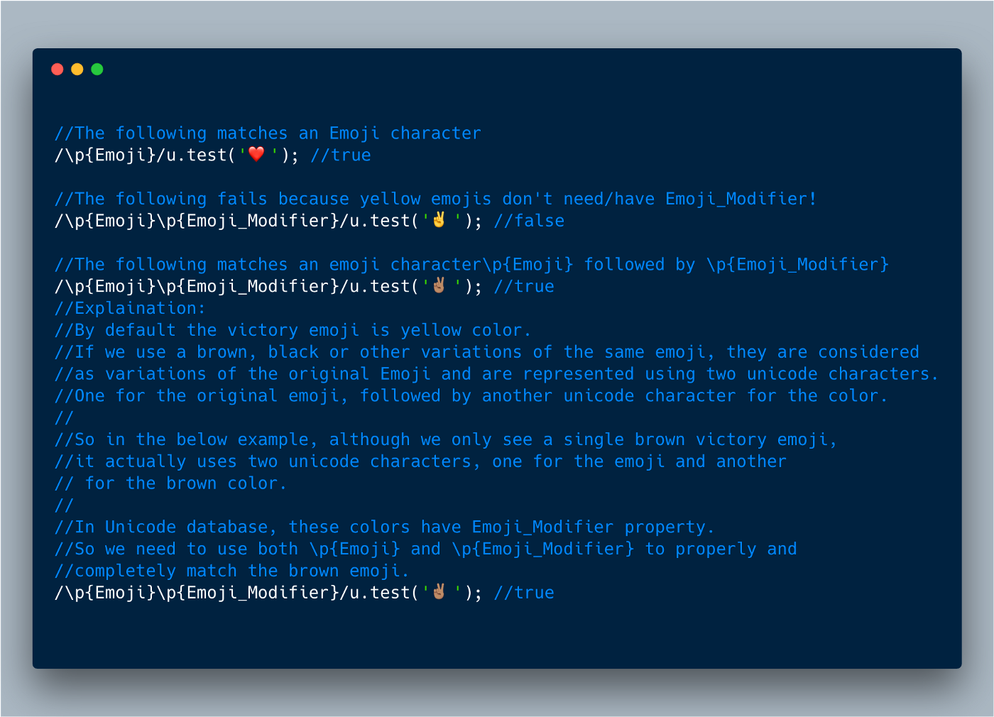 - /\p{Emoji}\p{Emoji_Modifier}/u.test(‘✌️’); //false