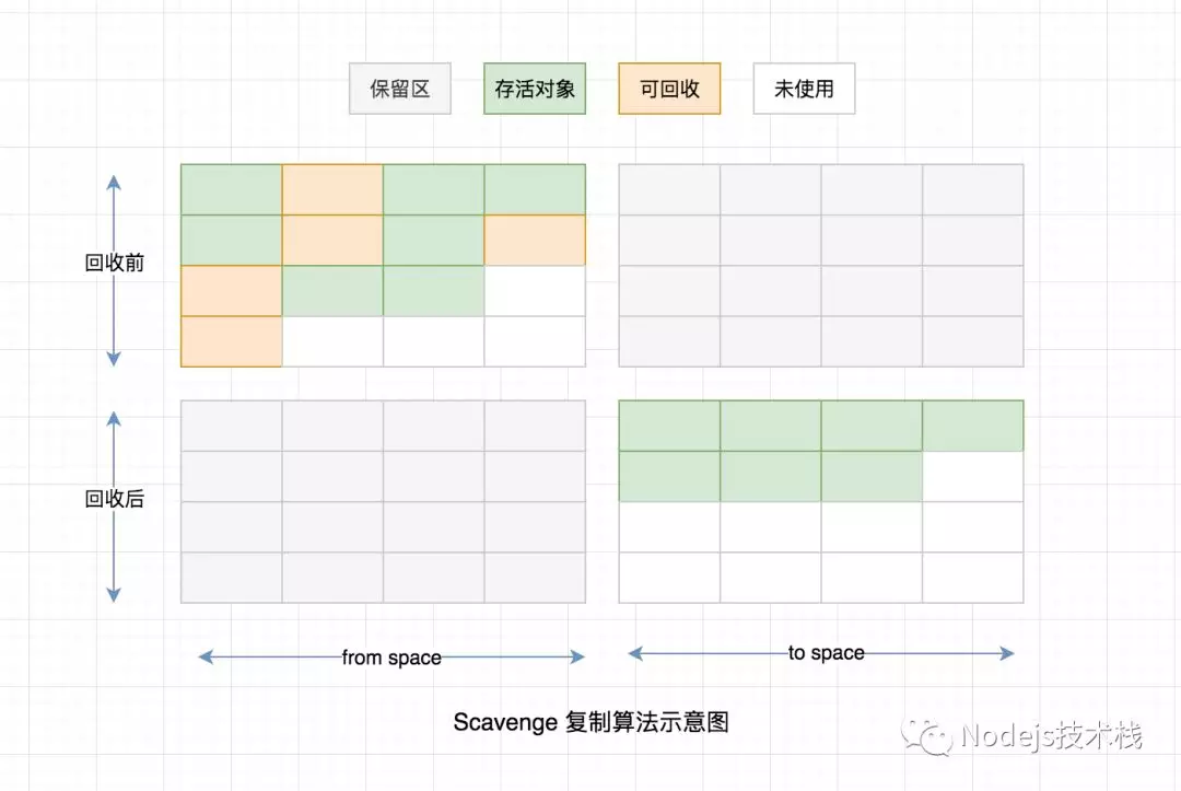 Scavenge 是一种复制算法,新生代空间会被一分为二划分成两个相等大小的 from-space 和 to-space。它的工作方式是将 from space 中存活的对象复制出来,然后移动它们到 to space 中或者被提升到老生代空间中,对于 from space 中没有存活的对象将会被释放。完成这些复制后在将 from space 和 to space 进行互换。