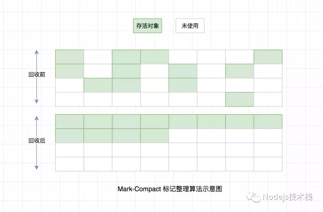 在老生代空间中为了解决 Mark-Sweep 算法的内存碎片问题,引入了 Mark-Compact(标记整理算法),其在工作过程中将活着的对象往一端移动,这时内存空间是紧凑的,移动完成之后,直接清理边界之外的内存。