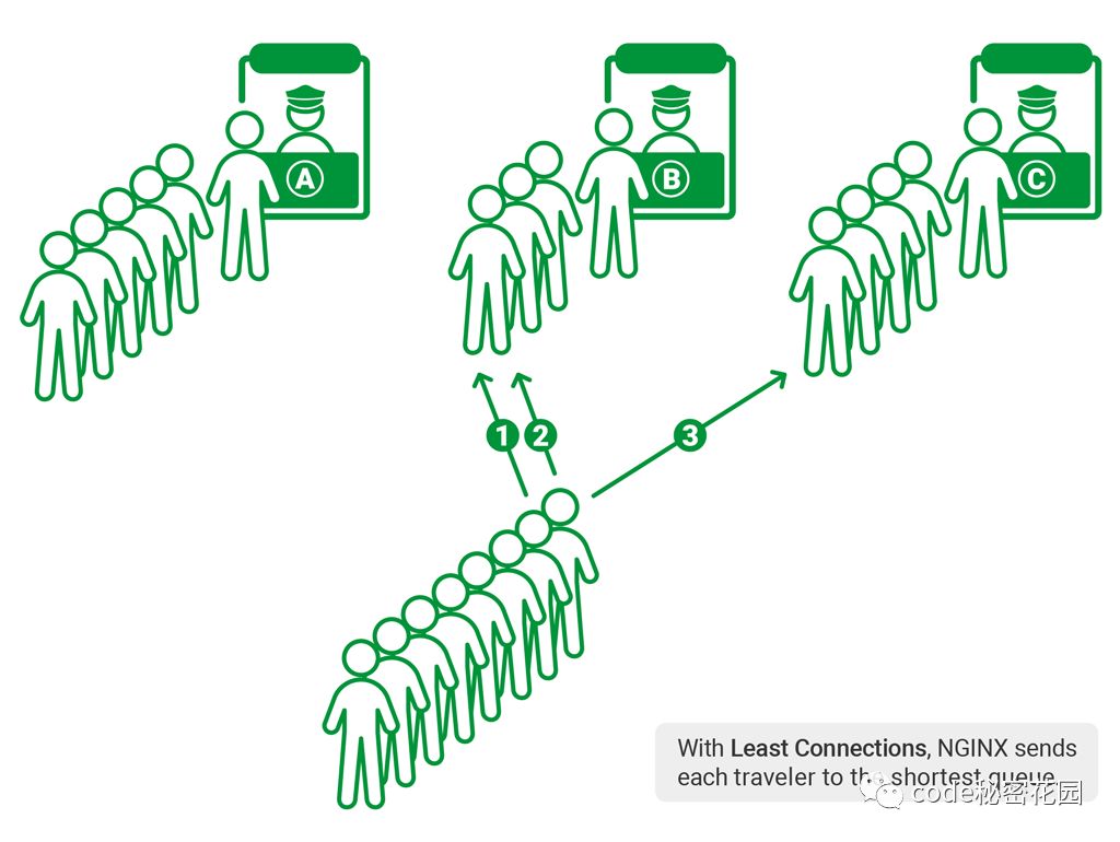 将请求优先分配给压力较小的服务器,它可以平衡每个队列的长度,并避免向压力大的服务器添加更多的请求。