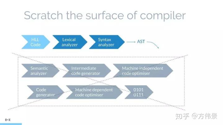 那怎么从纯文本中得到AST呢?哇哦,我们知道当下的编译器都做了这件事前。那我们就看看一般的编译器怎么做的就可以了。