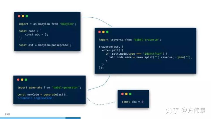 像我之前提到的,babel使用babylon,所以,首先,我们解析代码成AST,然后遍历AST,再反转所有的变量名,最后生成代码。完成!正如我们看到的,第一步(解析)和第三步(生成)看起来非常常规,我们每次都会做这两步。所以,babel接管处理了它俩。最后,我们最为关心的,那就是AST转译这一步了。