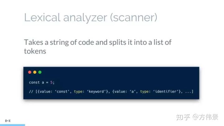 当词法分析源代码的时候,它会一个一个字母地读取代码,所以很形象地称之为扫描-scans;当它遇到空格,操作符,或者特殊符号的时候,它会认为一个话已经完成了。