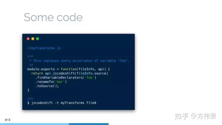 如果你听过 jscodeshift,你很可能也听过 codemods,一开始挺这两个词可能很困惑,不过没关系,接下来就解释。jscodeshift是一个跑 codemods的工具。 codemod是一段描述AST要转化成什么样的代码,这思想和babel的插件如出一辙。