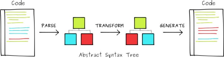 Babel的工作过程经过三个阶段,parse、transform、generate,具体来说,如下图所示,在parse阶段,使用babylon库将源代码转换为AST,在transform阶段,利用各种插件进行代码转换,如图中的JSX transform将React JSX转换为plain object,在generator阶段,再利用代码生成工具,将AST转换成代码。