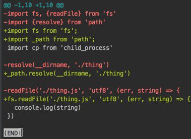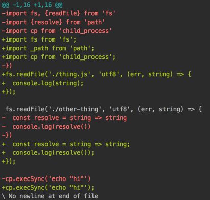 在这样的过程中,我们会检查转换脚本对源代码到底做了哪些变更,来确认我们的转换正确性。这就需要这一个差异结果是可读的,而直接使用Babel完成上述转换时,使用git diff输出差异结果时,这份差异结果是混乱不可读的。