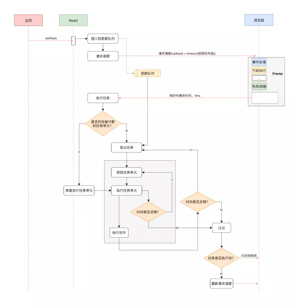 所以React 是怎么优化的? 划重点, 🔴为了给用户制造一种应用很快的’假象’,我们不能让一个程序长期霸占着资源. 你可以将浏览器的渲染、布局、绘制、资源加载(例如HTML解析)、事件响应、脚本执行视作操作系统的’进程’,我们需要通过某些调度策略合理地分配CPU资源,从而提高浏览器的用户响应速率, 同时兼顾任务执行效率
