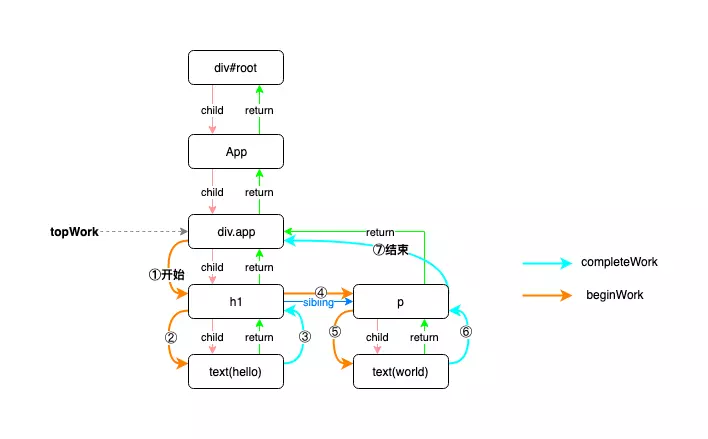 5. 把孩子或兄弟作为待处理节点,准备进入下一个工作循环。如果没有待处理节点(回到了workInProgress tree的根节点),工作循环结束