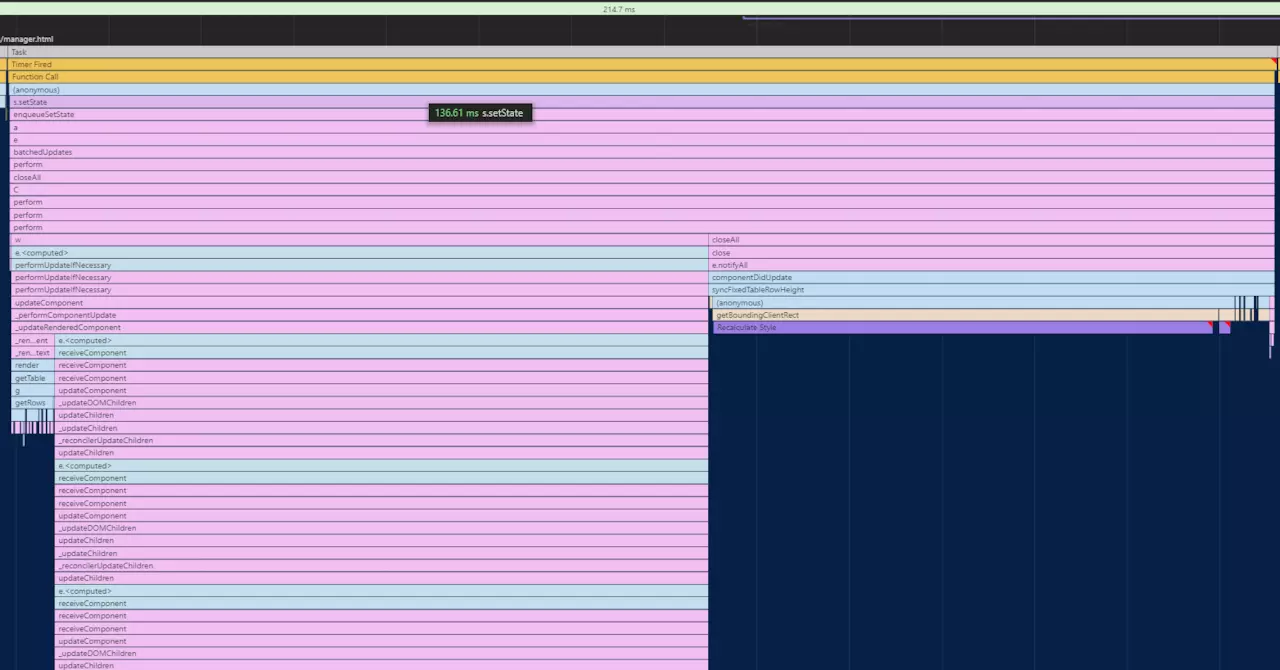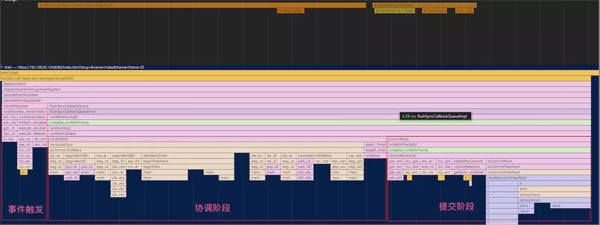 React 为什么要引入 Fiber 架构? 看看下面的火焰图,这是React V15 下面的一个列表渲染资源消耗情况。整个渲染花费了130ms, 🔴在这里面 React 会递归比对VirtualDOM树,找出需要变动的节点,然后同步更新它们, 一气呵成。这个过程 React 称为 Reconcilation(中文可以译为协调).