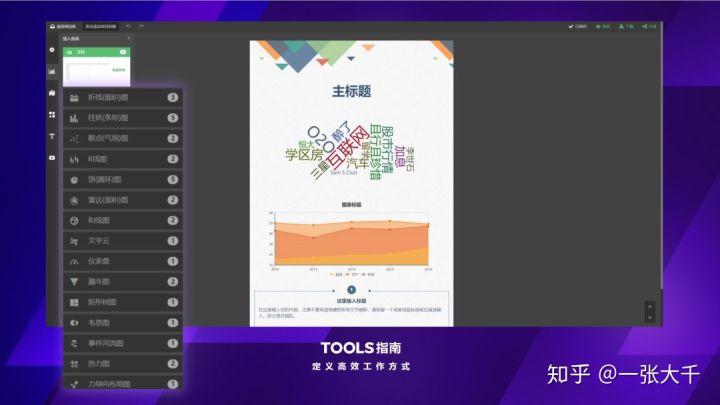 作为数据可视化报告,它支持自由增添的图表类型非常多。除了常见的折线图、柱形图,还有显示效果非常赞的「文字云」类型:
